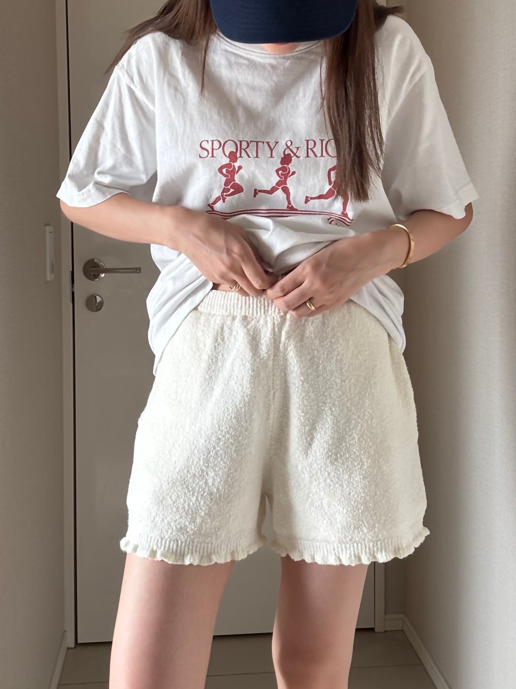ボディラインを拾わないゆったりとしたサイズ感に、裾にはリブと控えめなフリルをあしらい、ゴムウエストの内側には共地の紐を。