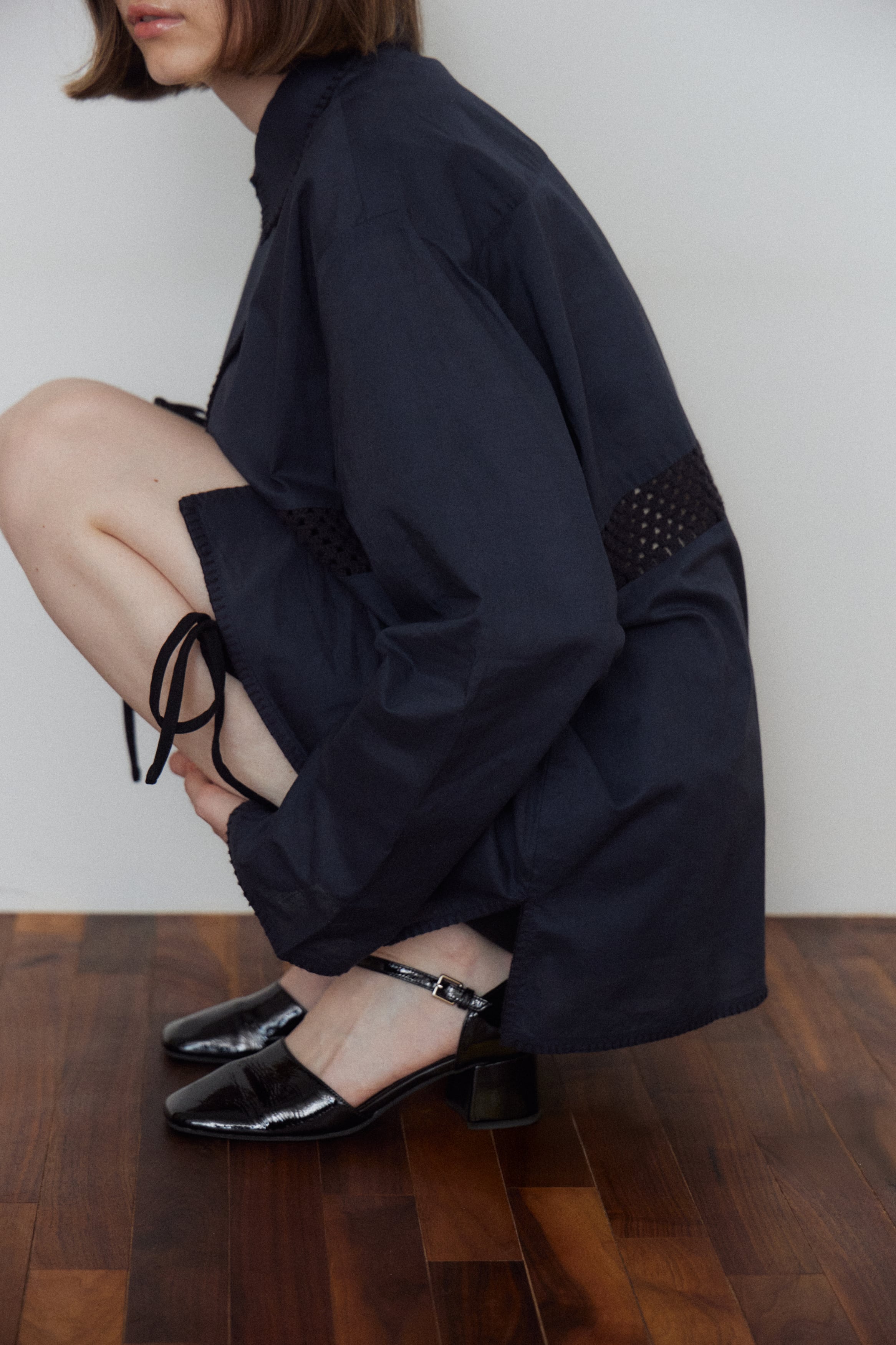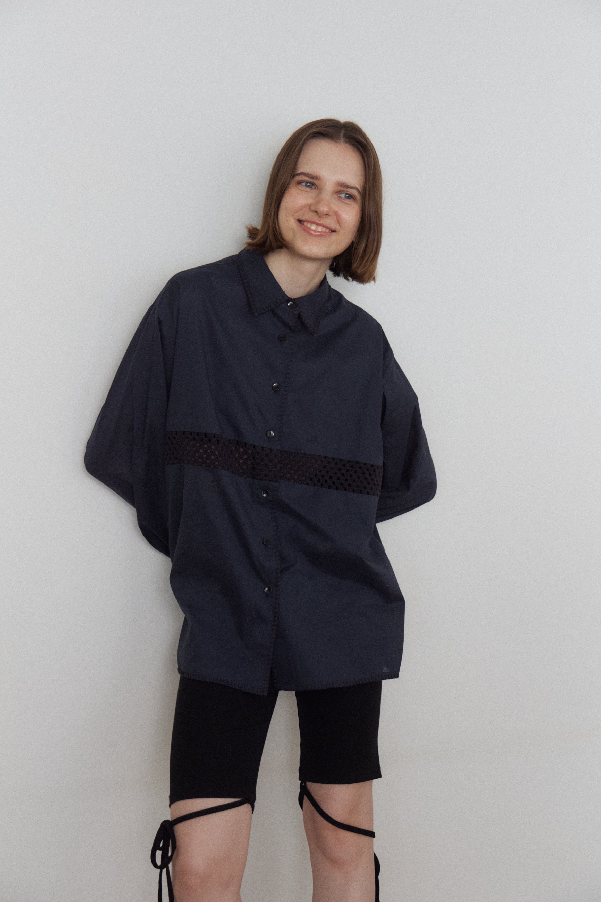 メンズシャツをベースに、袖周りや丈感、スリットなど細部を女性が着やすいシルエットへと調整。