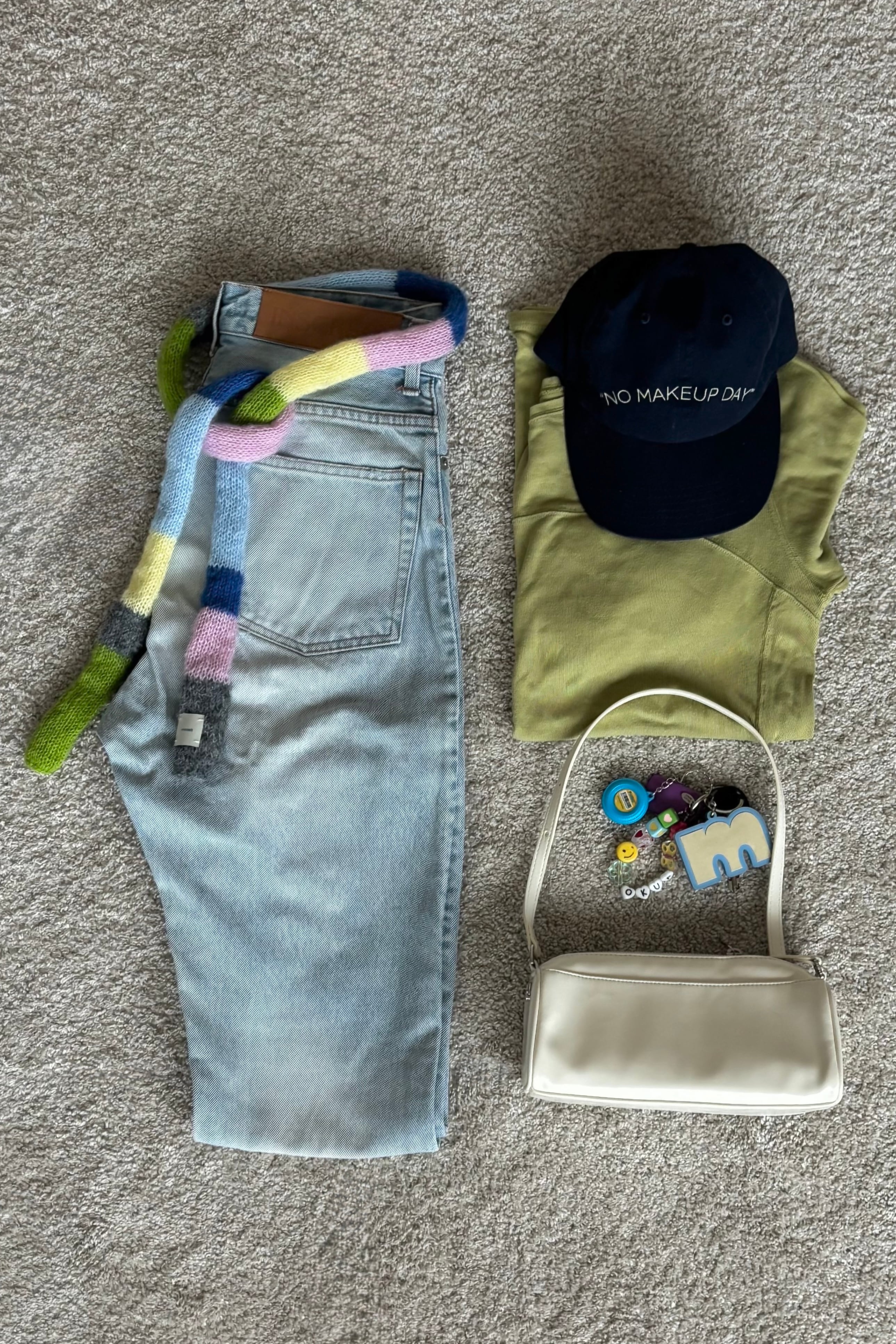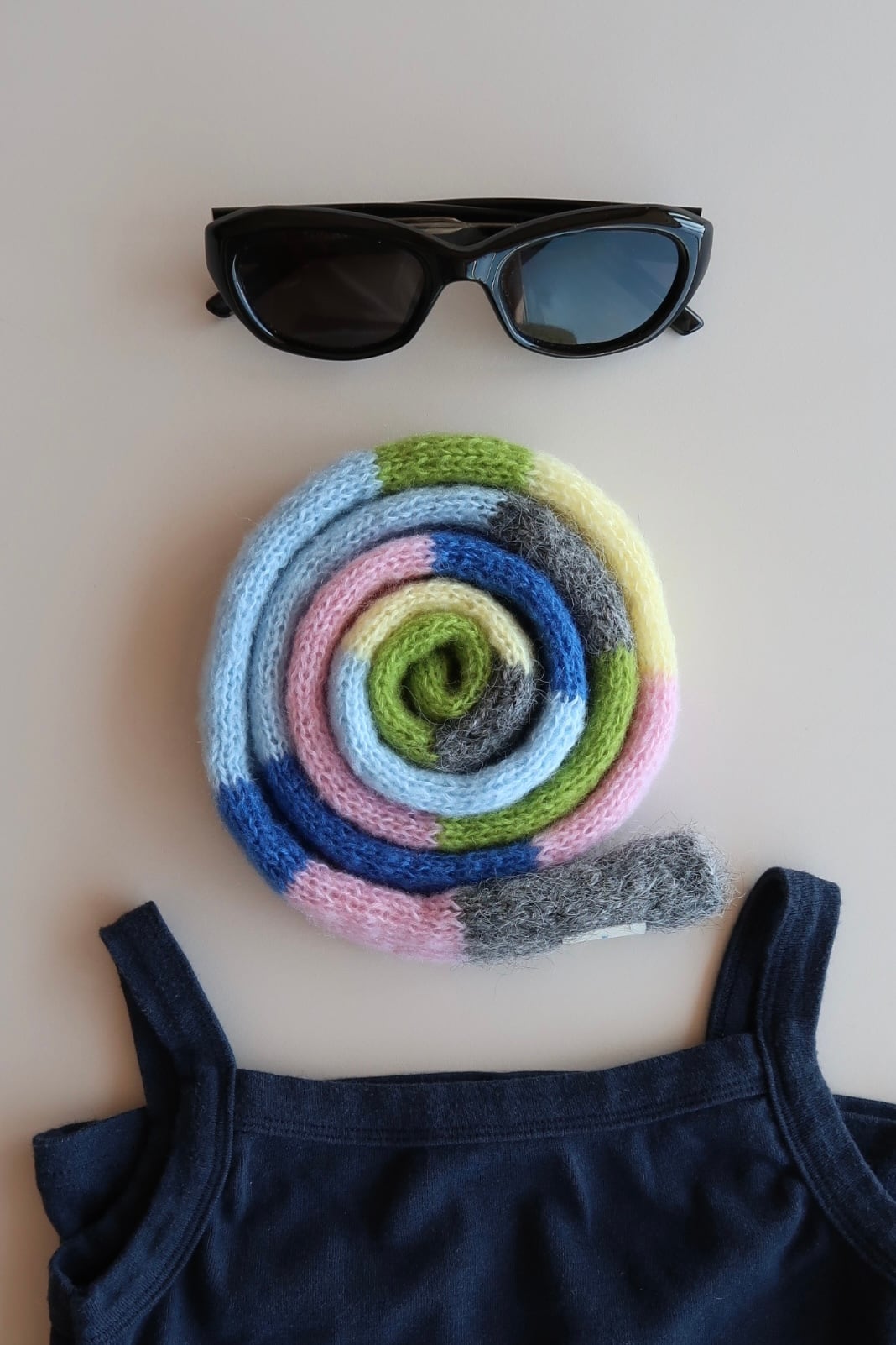 これからの季節でも、首に巻くのはもちろん、腰に巻いたりバッグにつけたりと自由にニットのスタイリングを楽しめます。