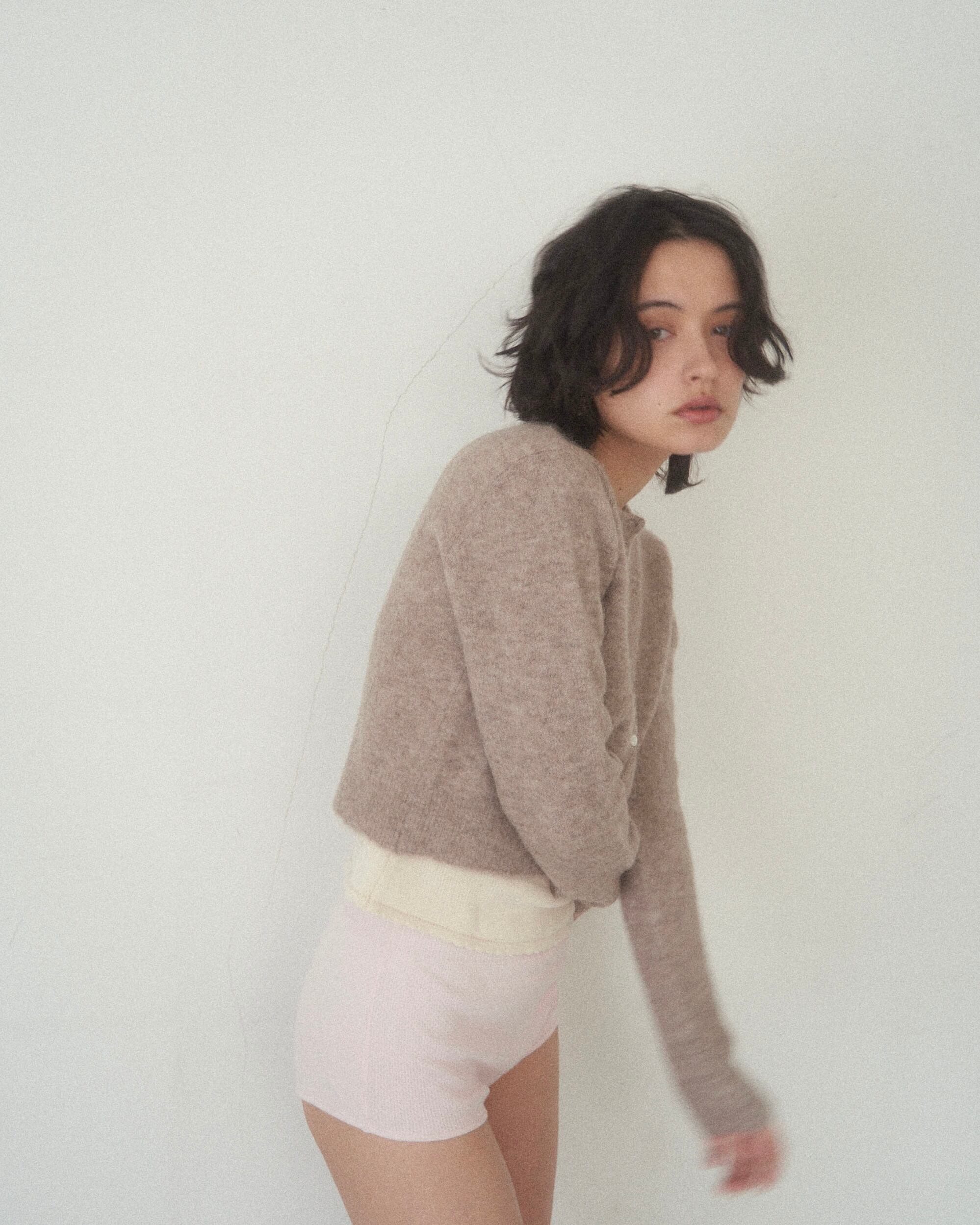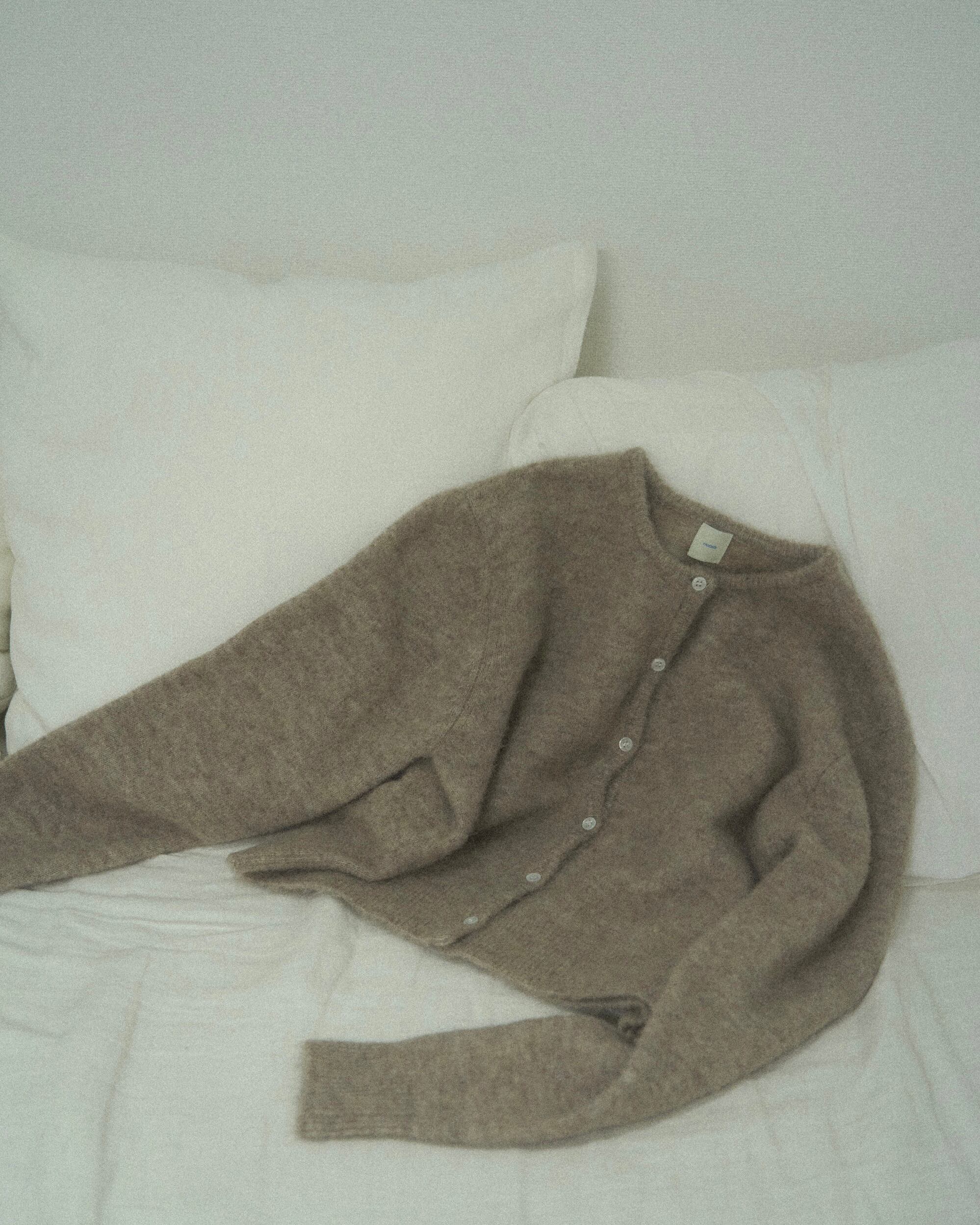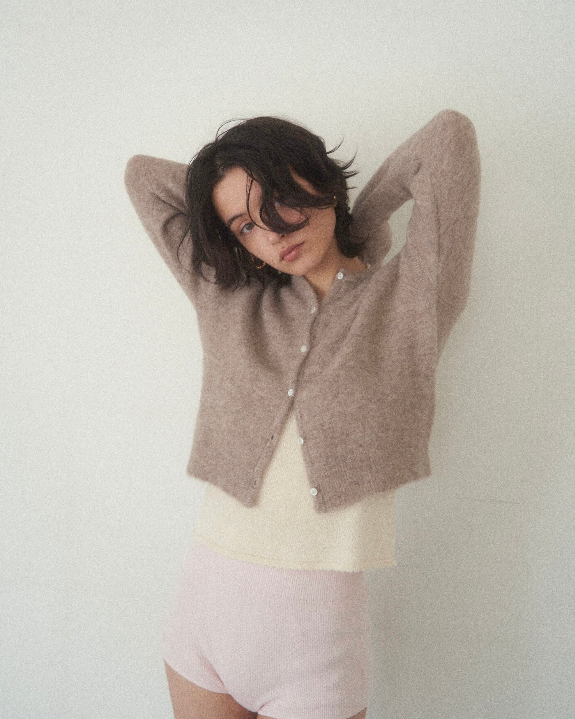 アルパカを使用しているため、とっても軽くてあたたかいのが特徴。モチモチした素材で素肌でも心地の良いカーディガンです。