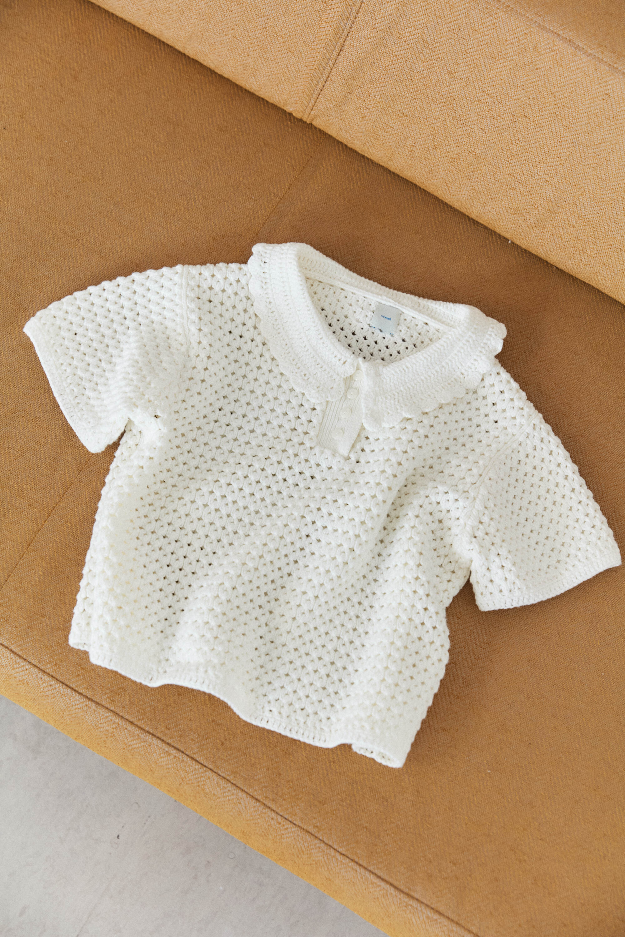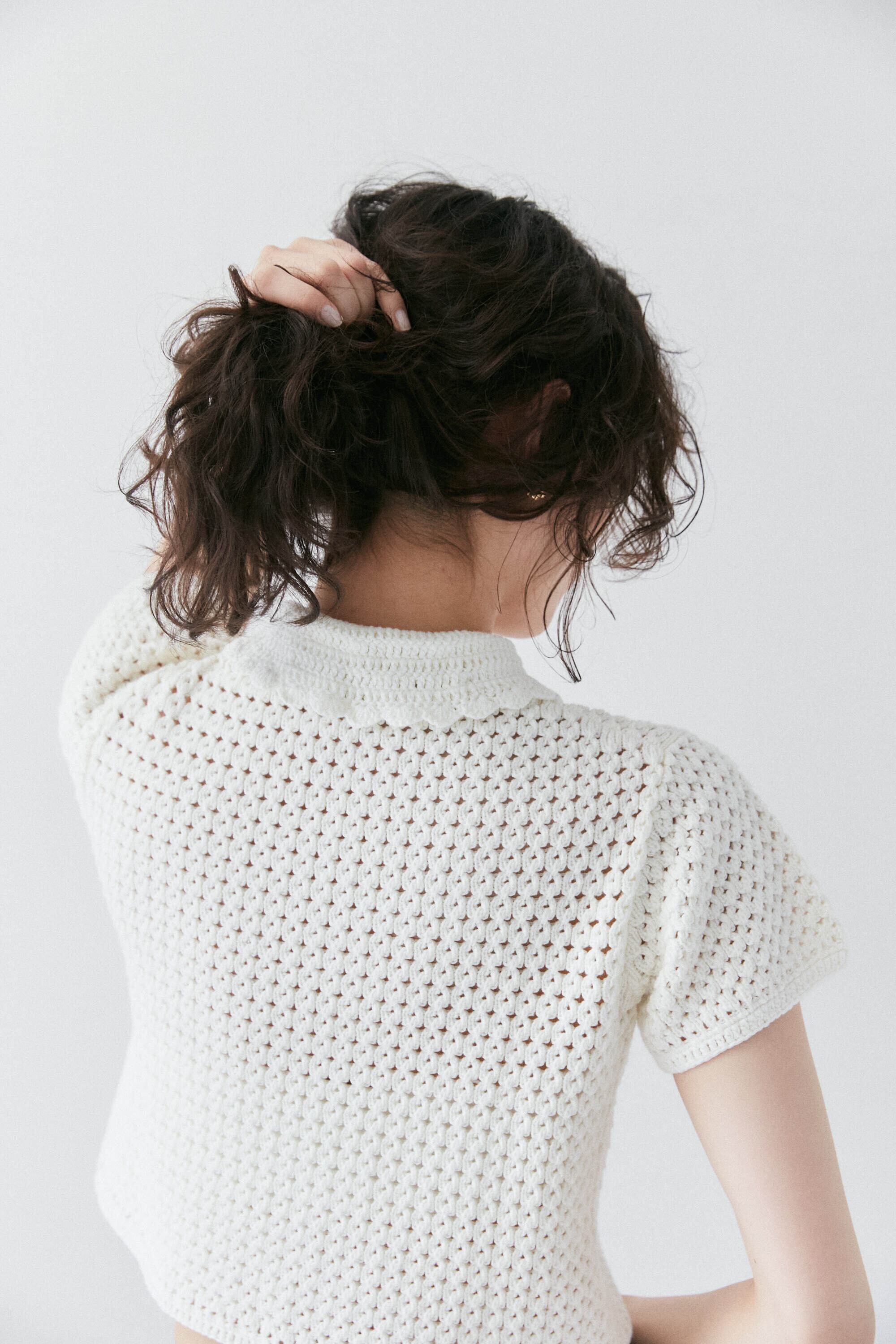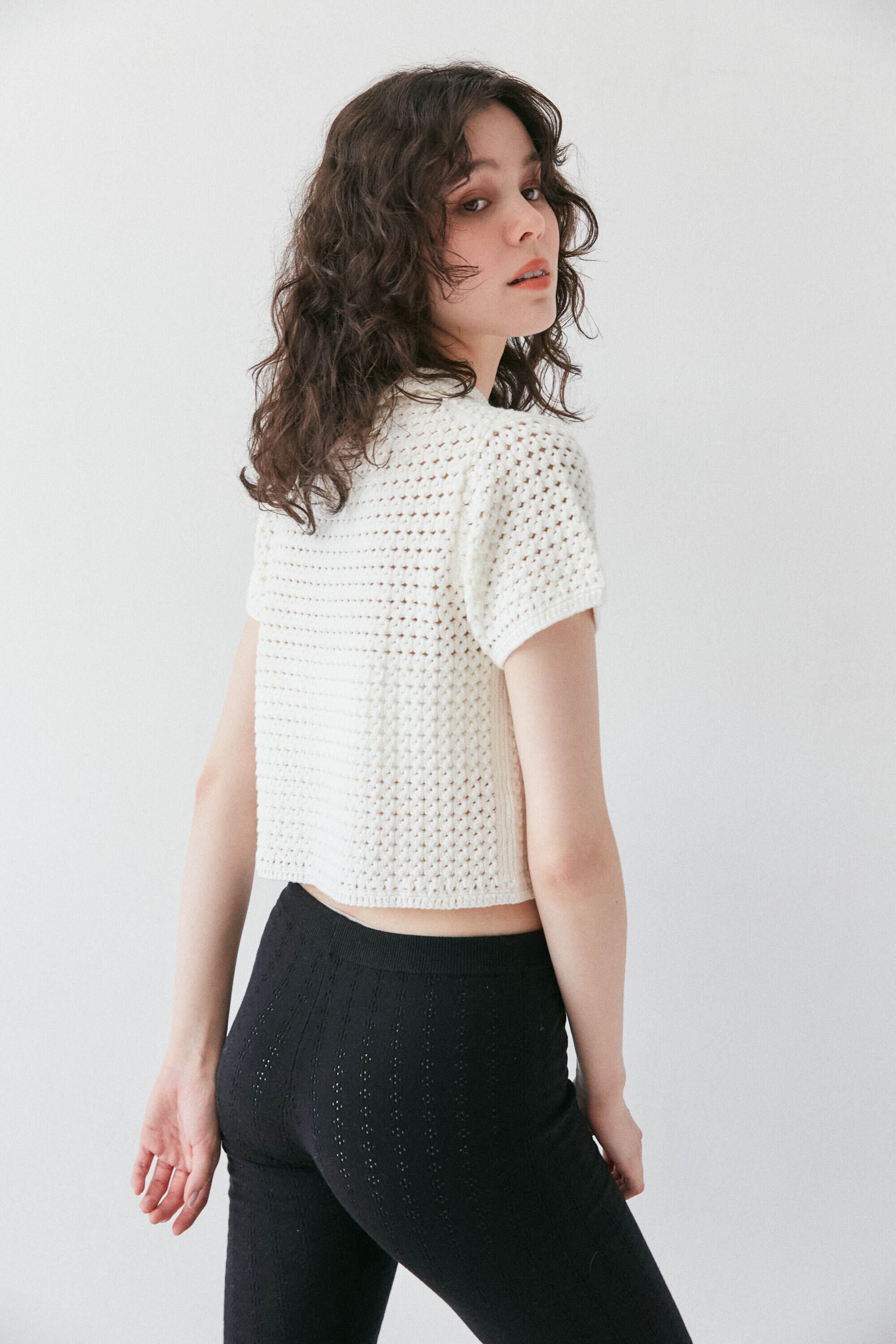 糸が収縮して膨らむため嵩高が増し、軽く柔らかな糸が混ざったcotton素材を使用しているため、ニットらしい表情感でありながらも透かし編みで通気性があります。