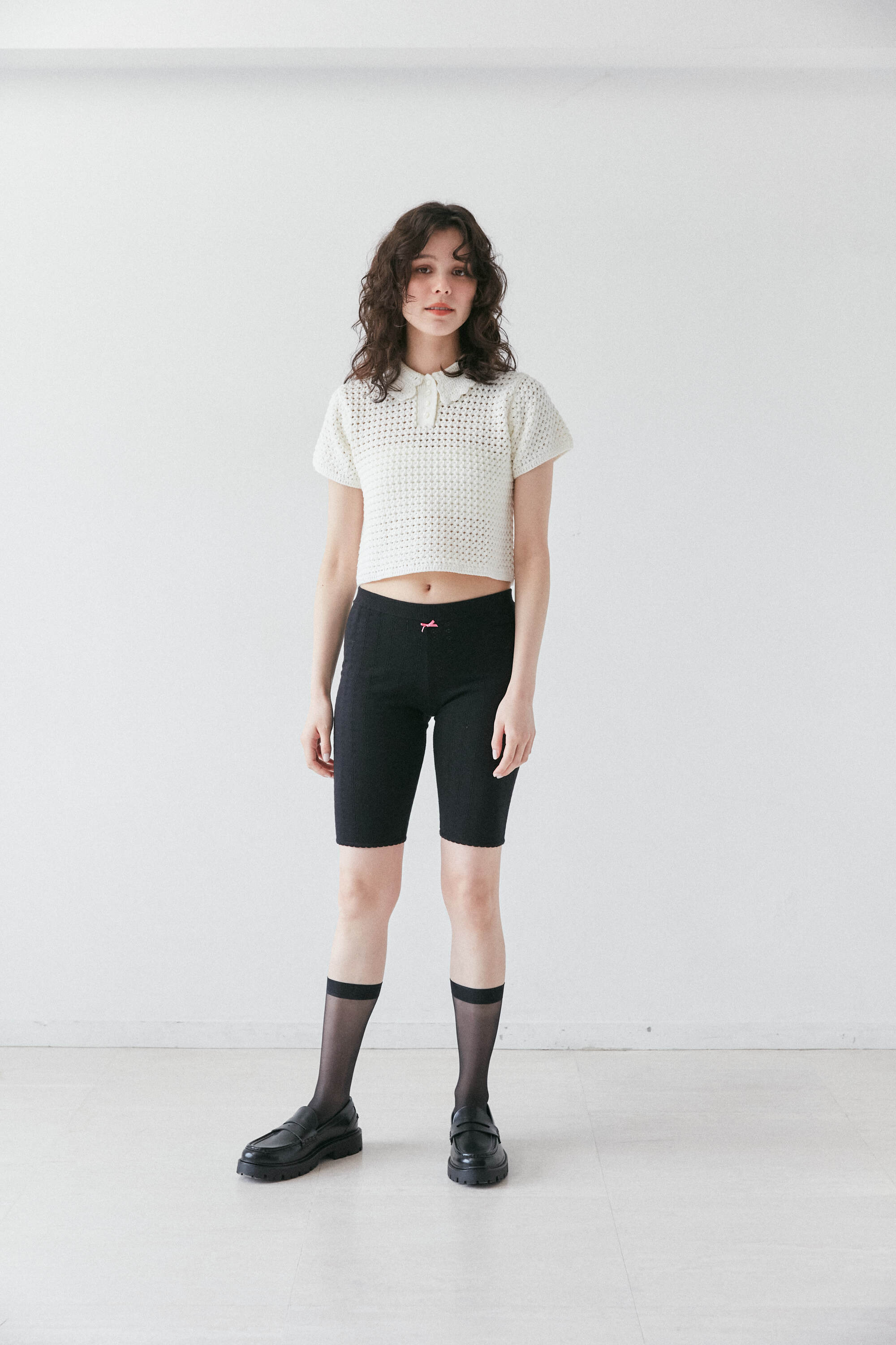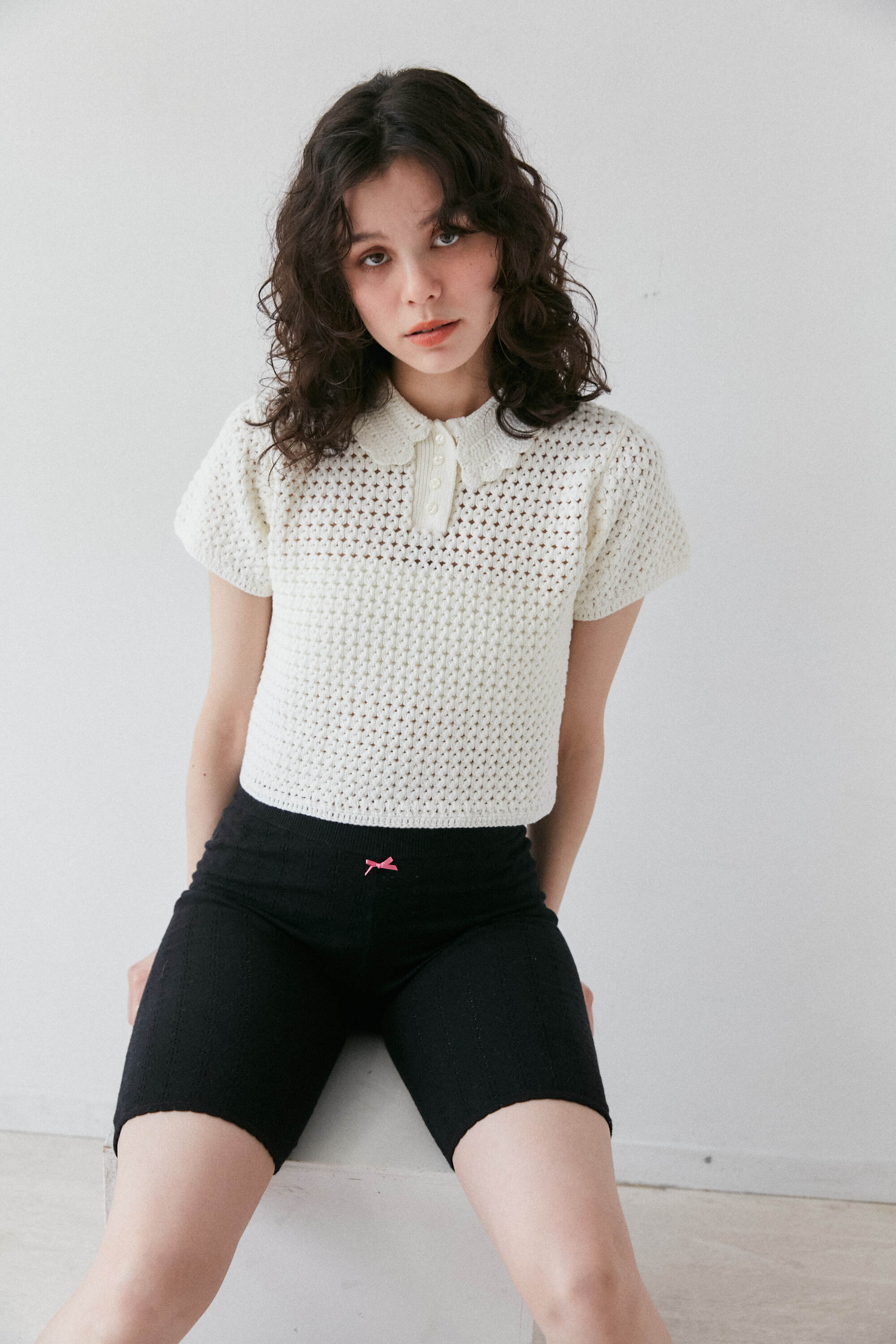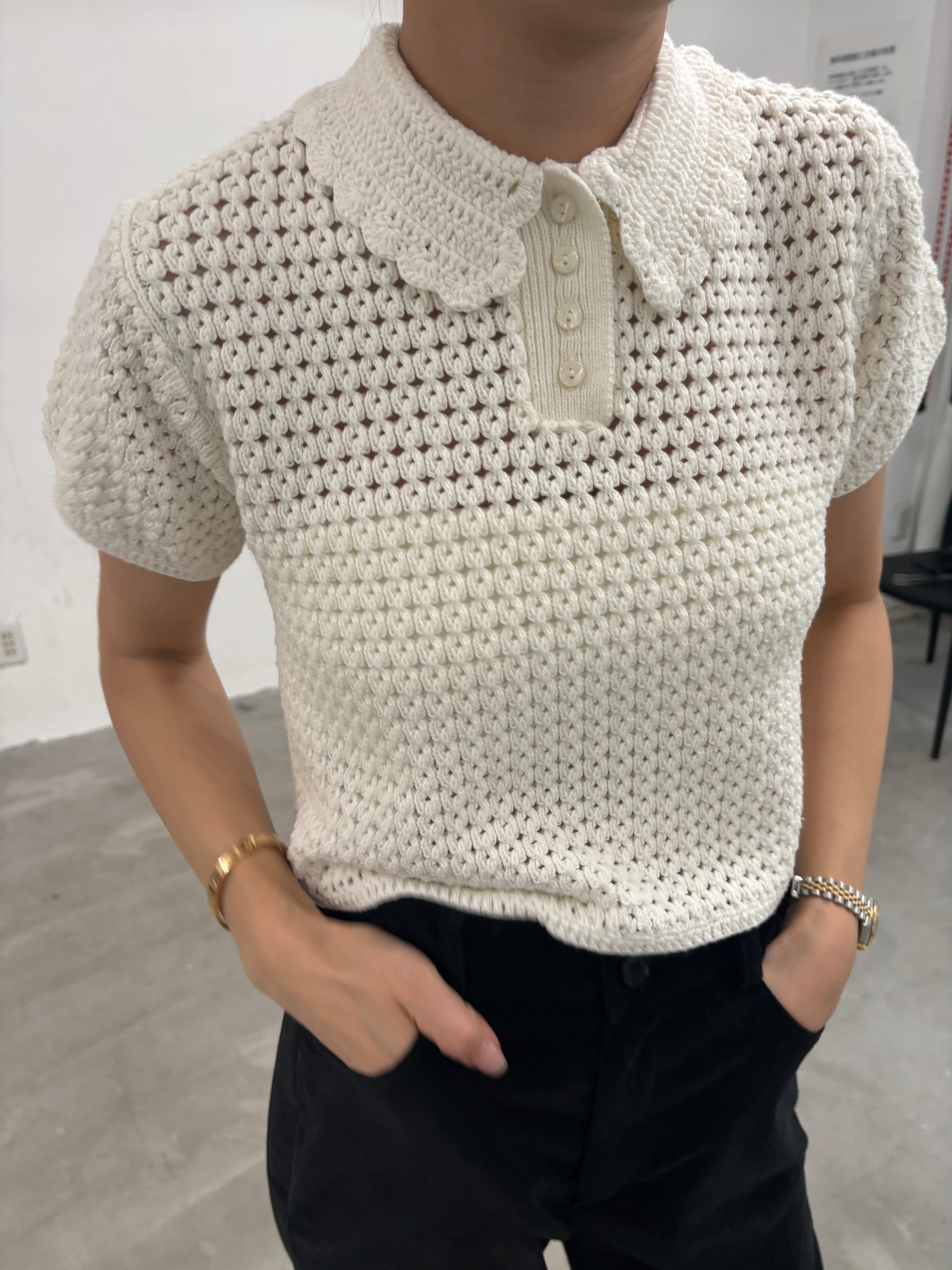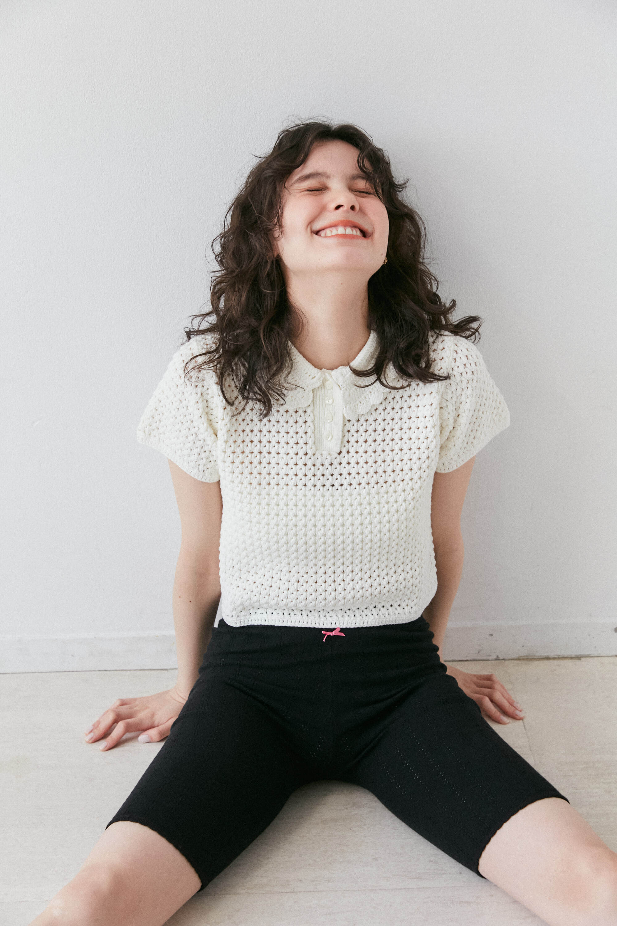 糸が収縮して膨らむため嵩高が増し、軽く柔らかな糸が混ざったcotton素材を使用しているため、ニットらしい表情感でありながらも透かし編みで通気性があります。