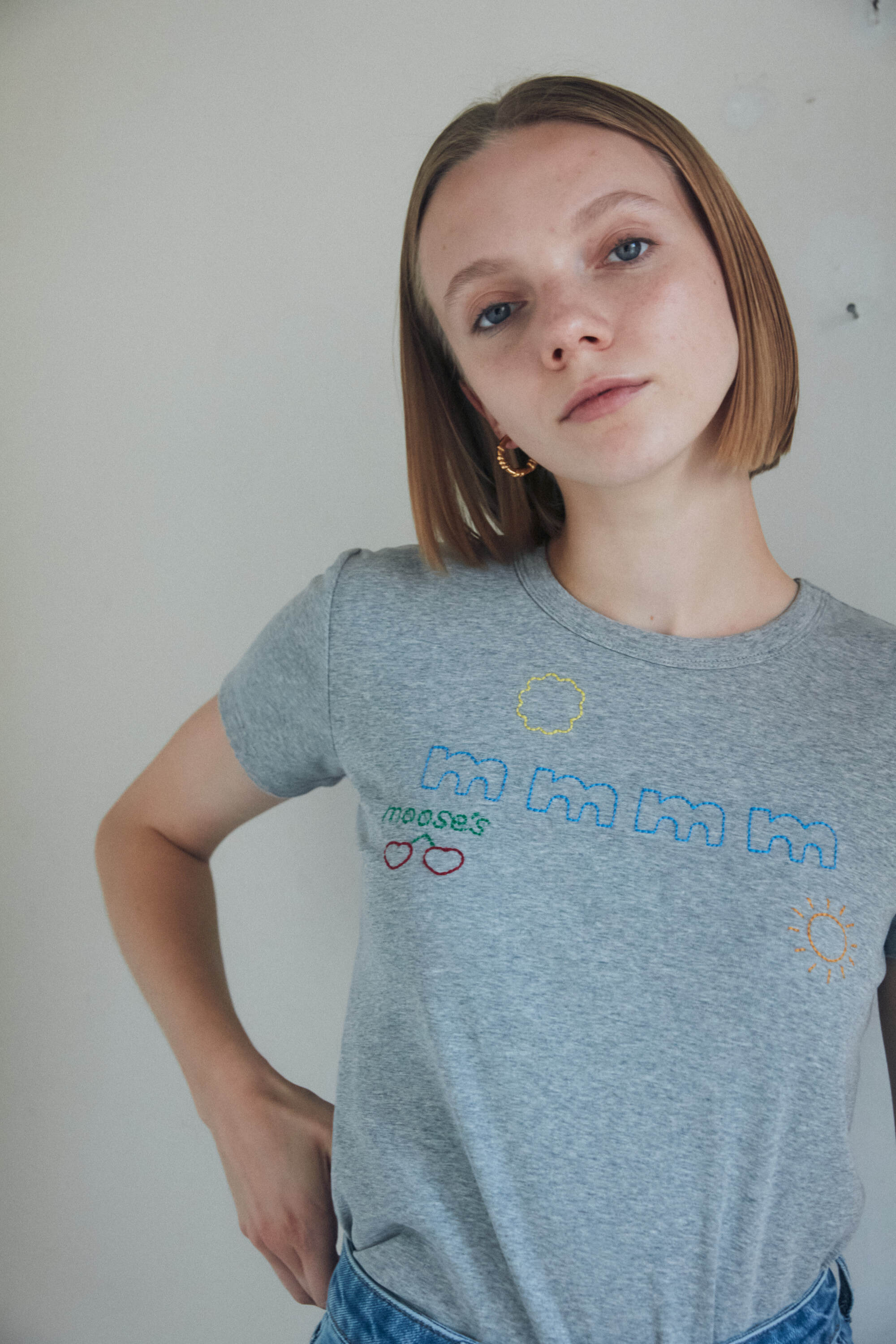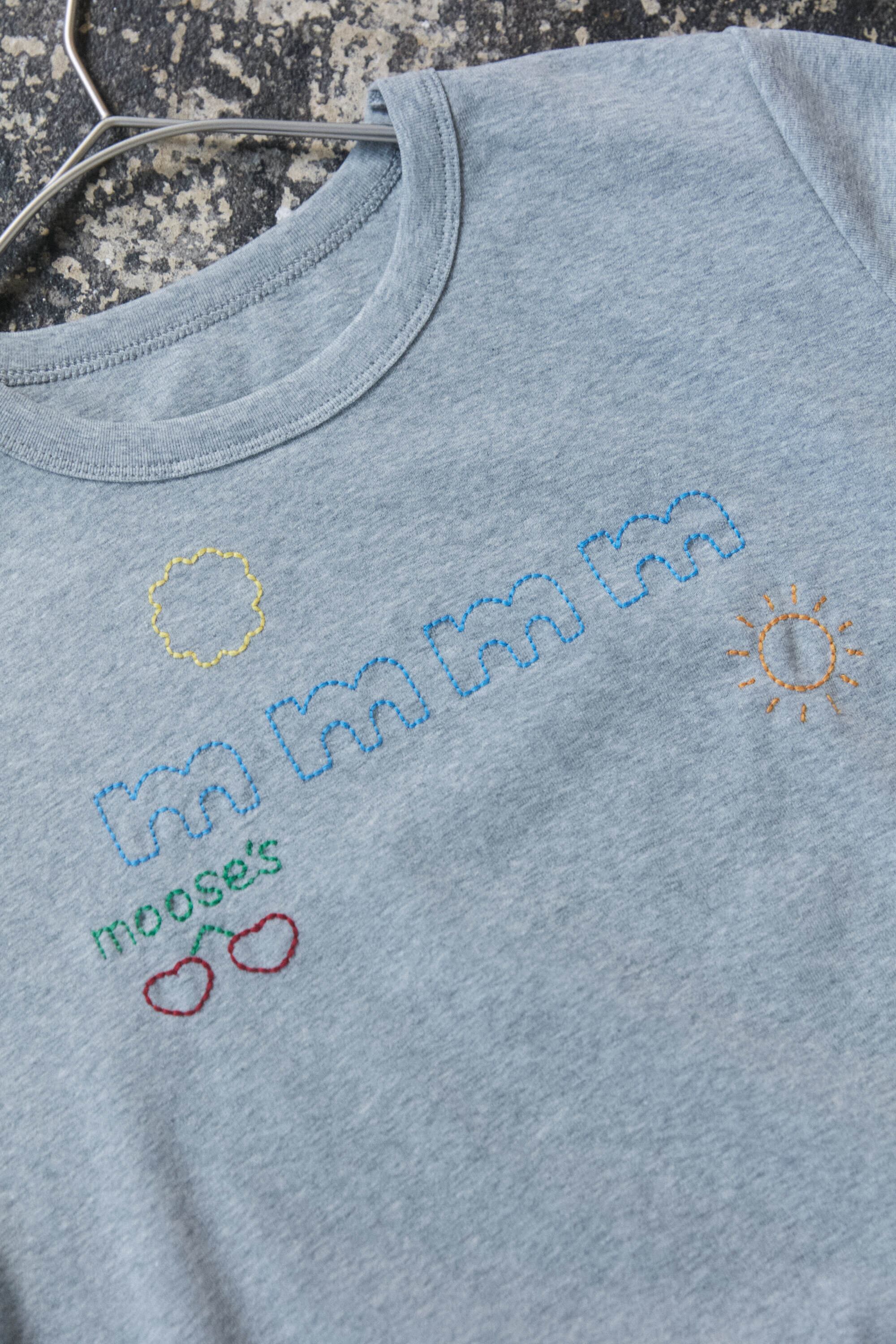 手書きの絵柄を刺繍に落とし込み、ステッチ縫いでの表現が、moose’s らしさ全開の一着です♩