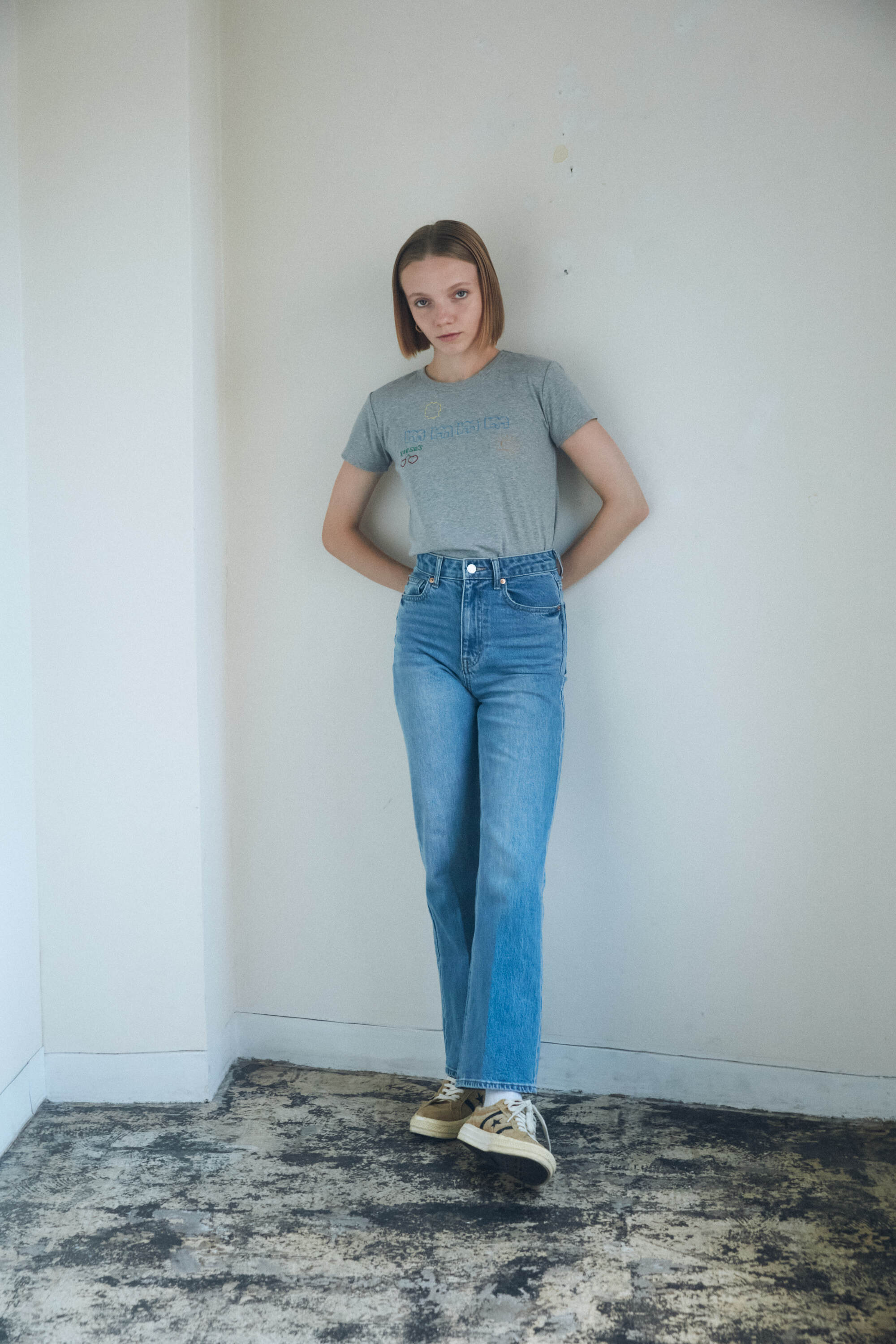 秋冬でもニットやカーディガンの中に着られるようネックの詰まり方や身幅などもこだわりのサイズ感。