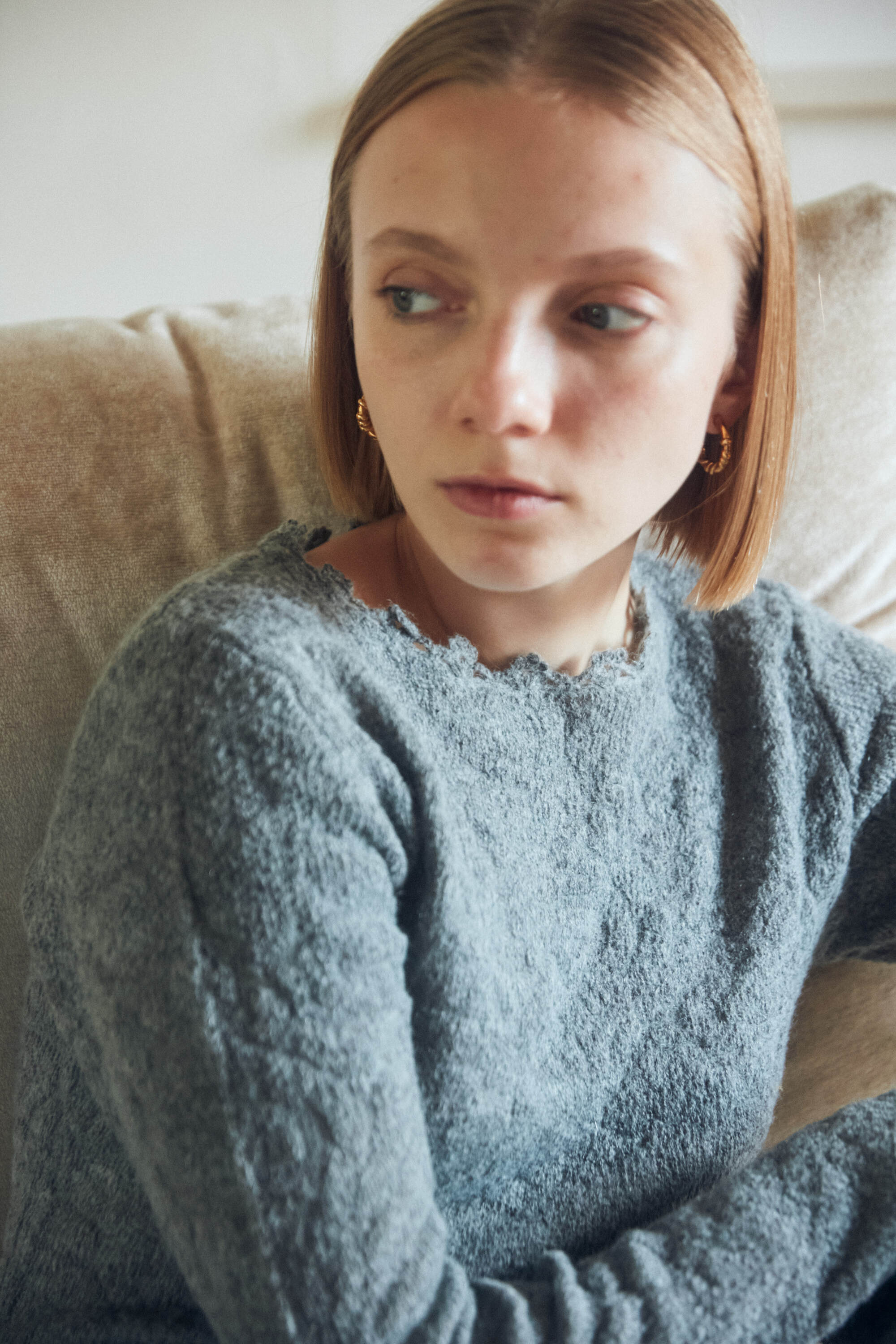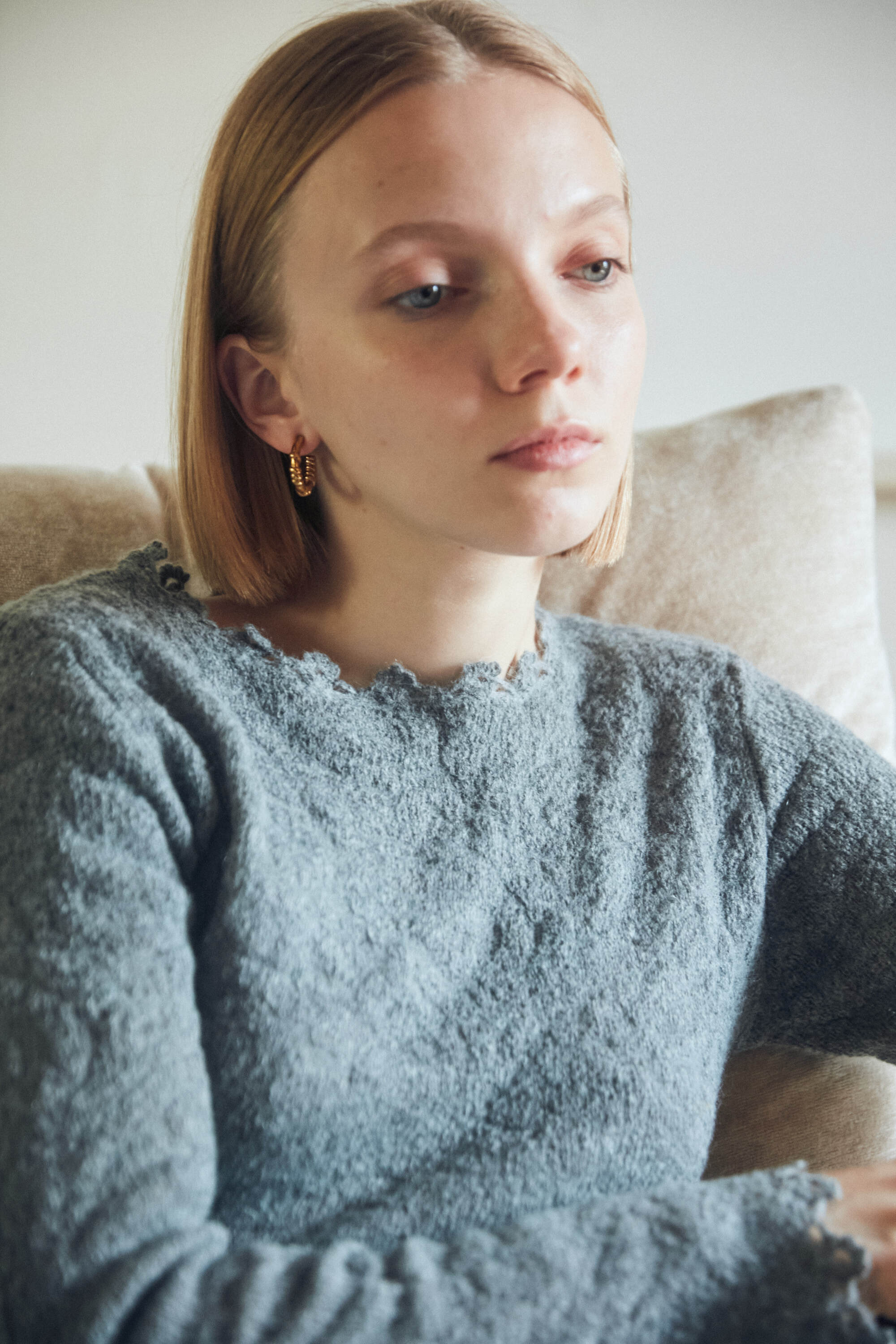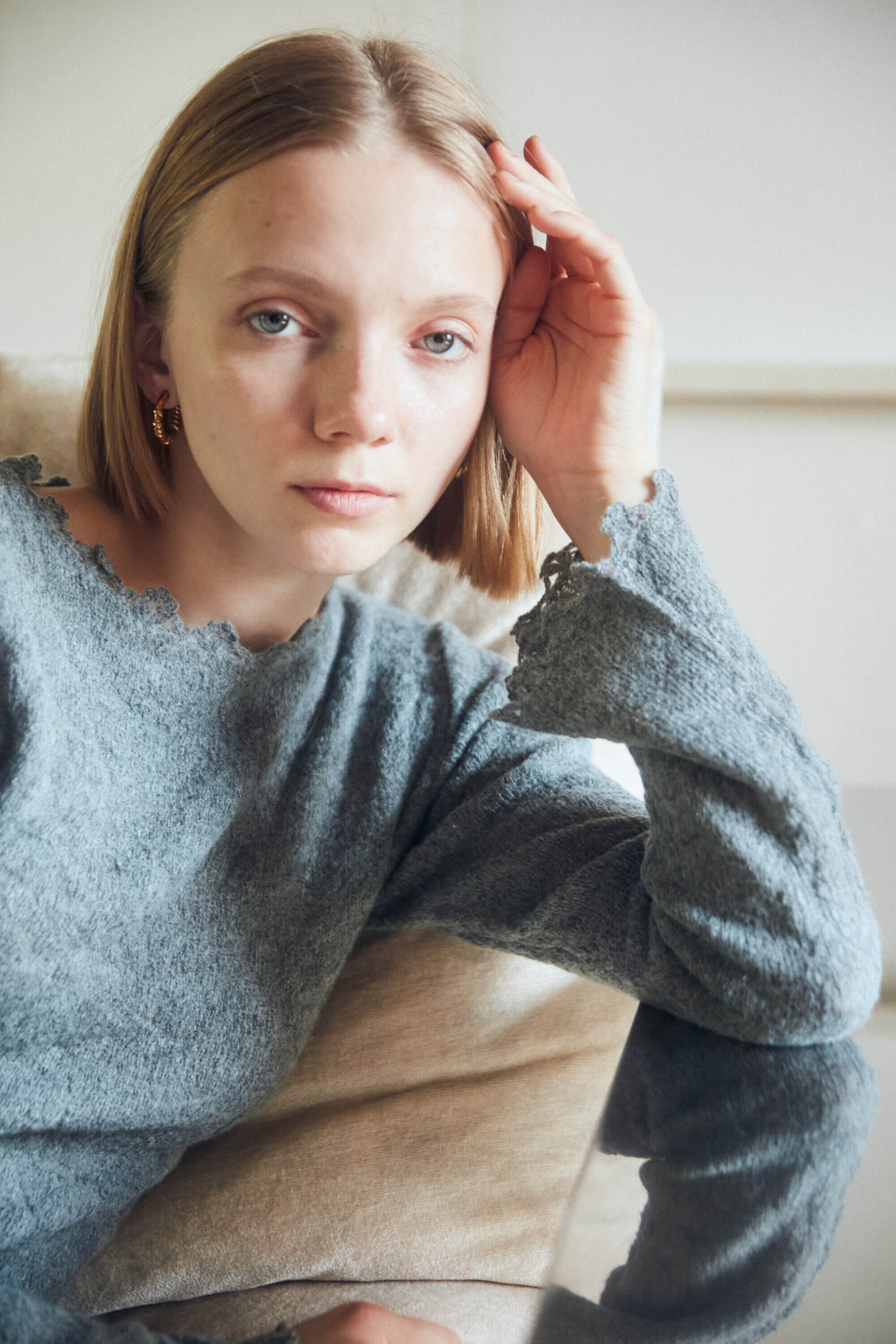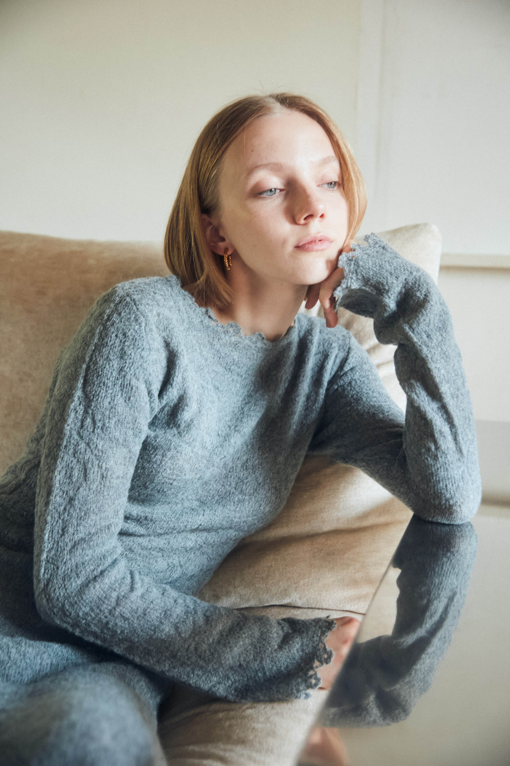 モヘヤ混でふわふわと柔らかく、フルレングスでもエアリーな着心地の良い素材です。