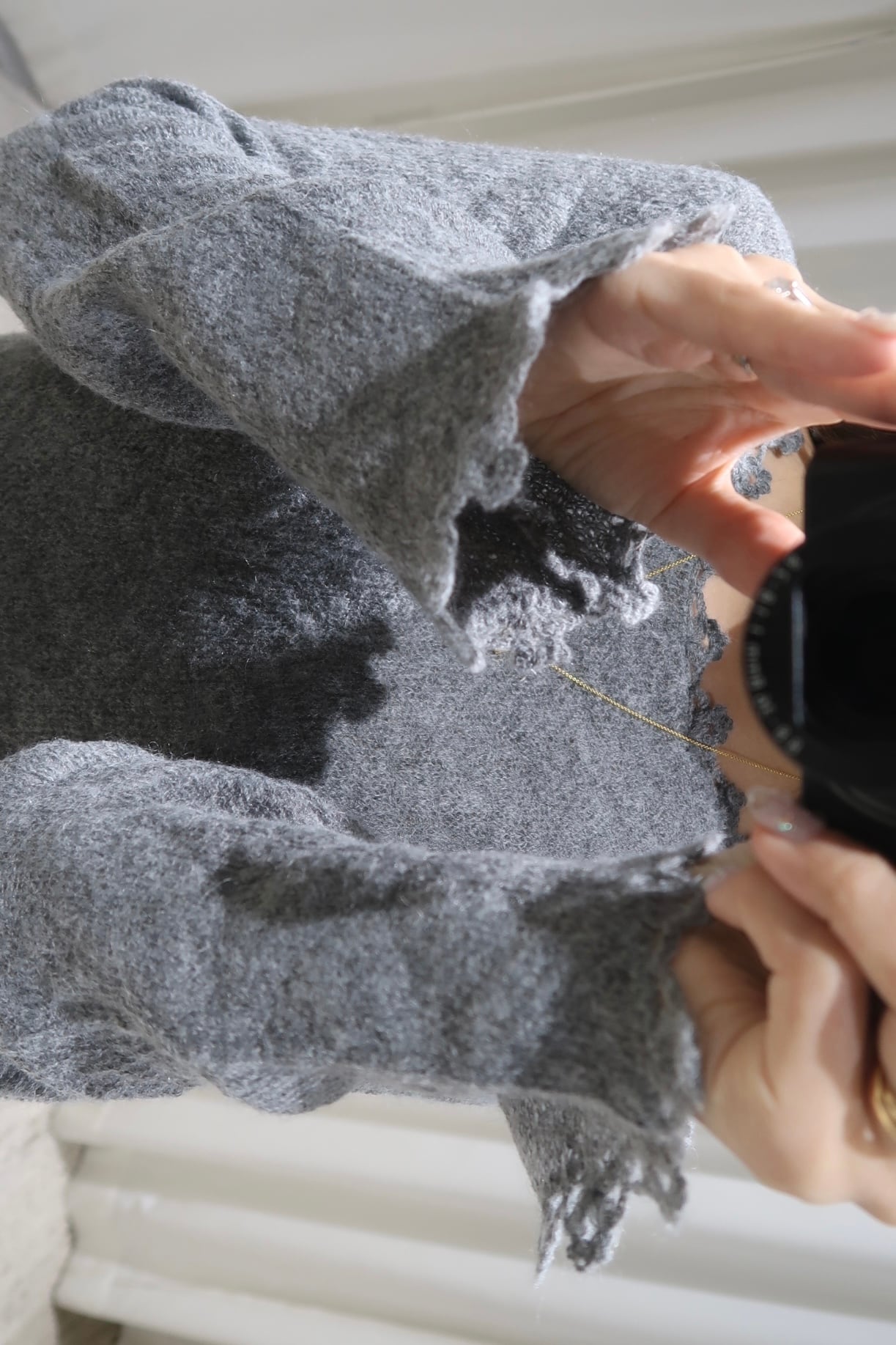 また首元と袖にはかぎ編み、裾にも編み方の違うレースをつけ細部まで贅沢に仕上げました。