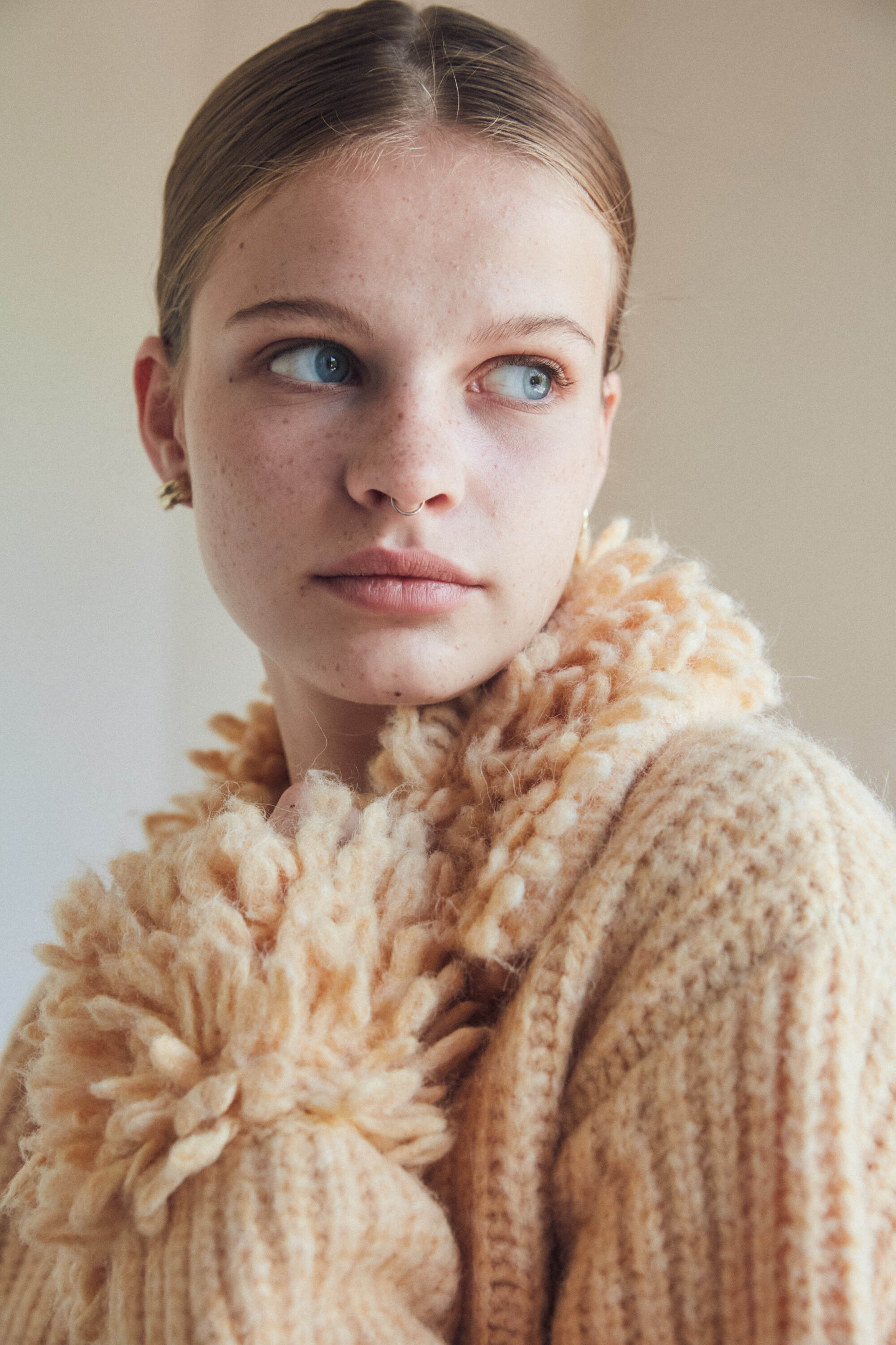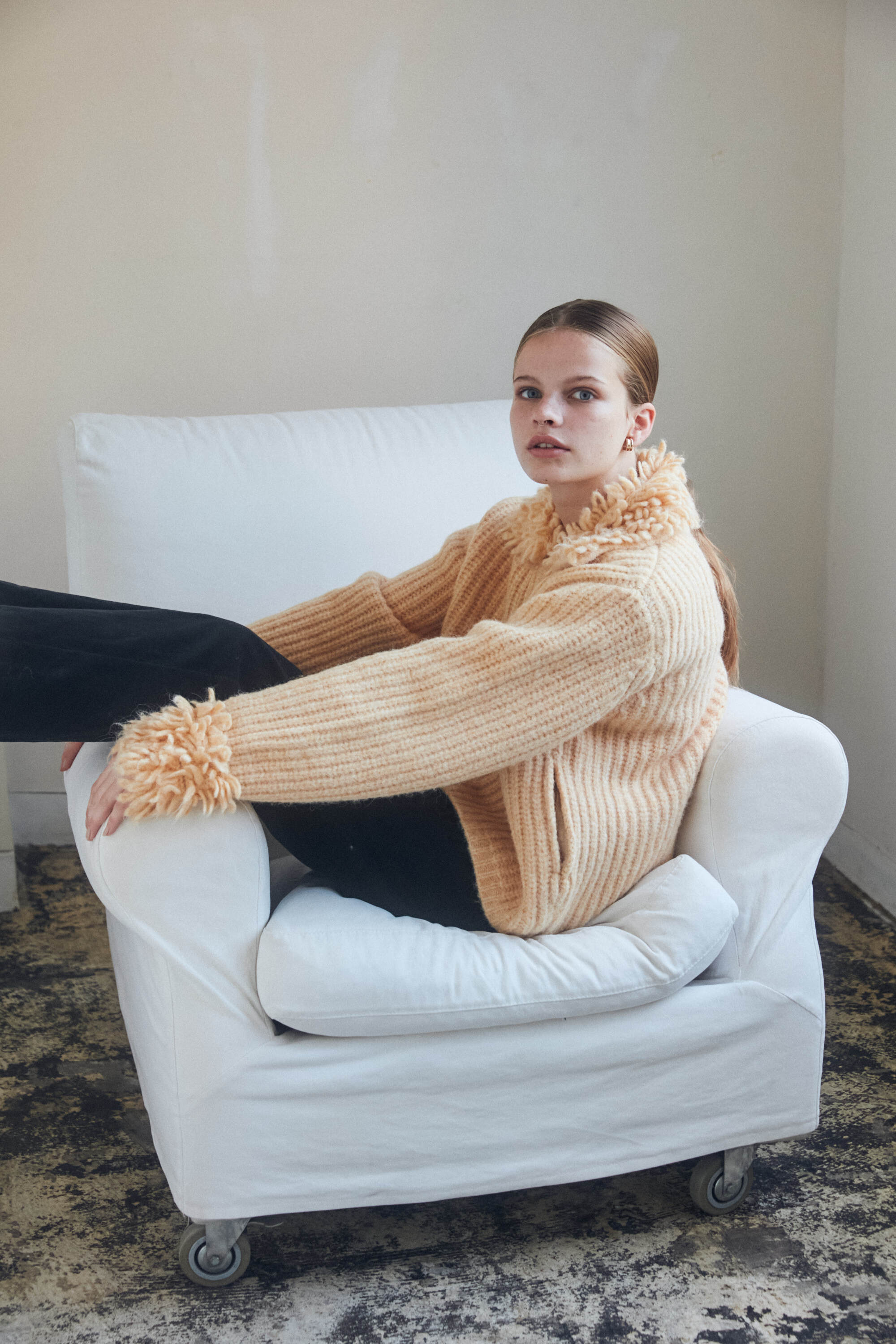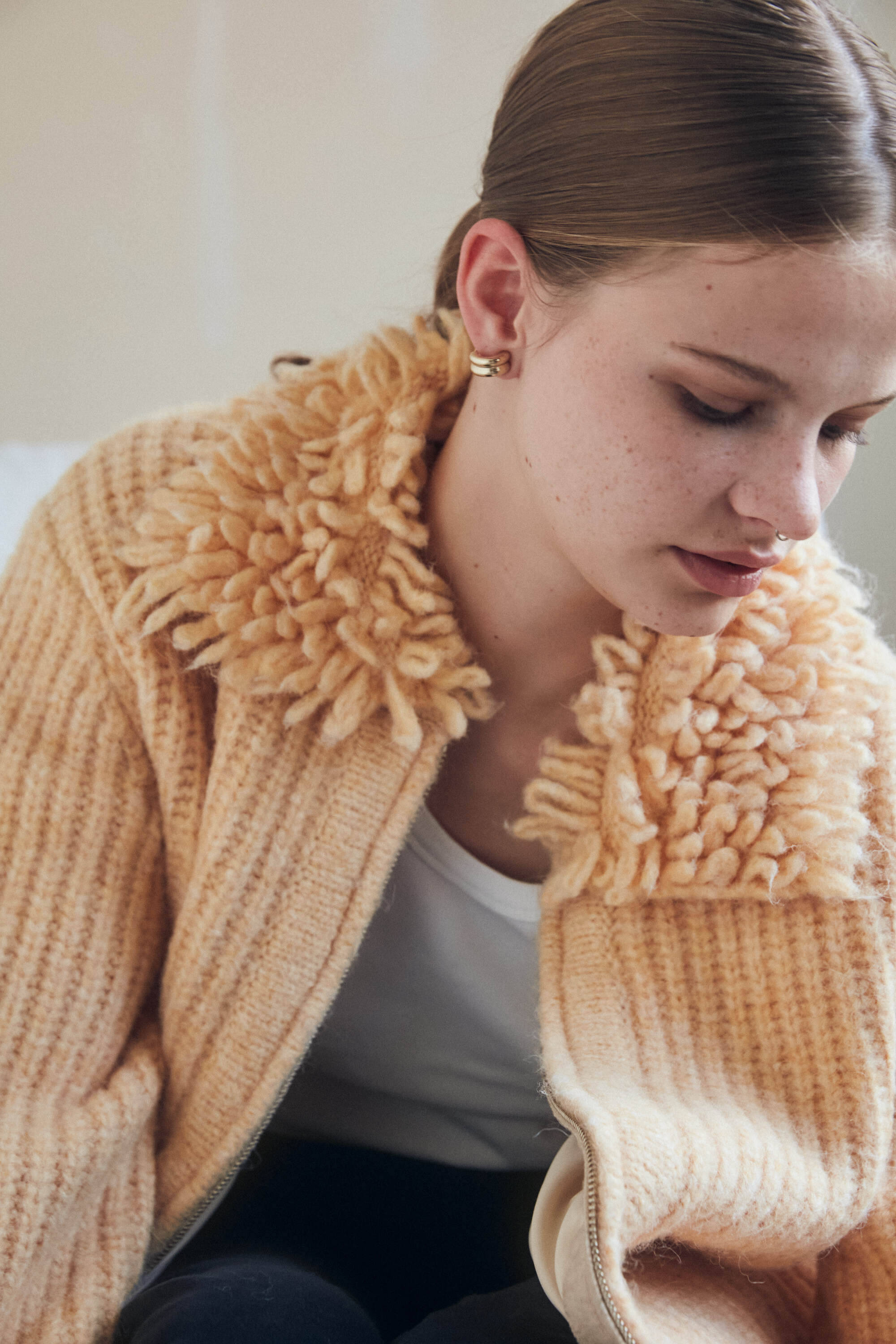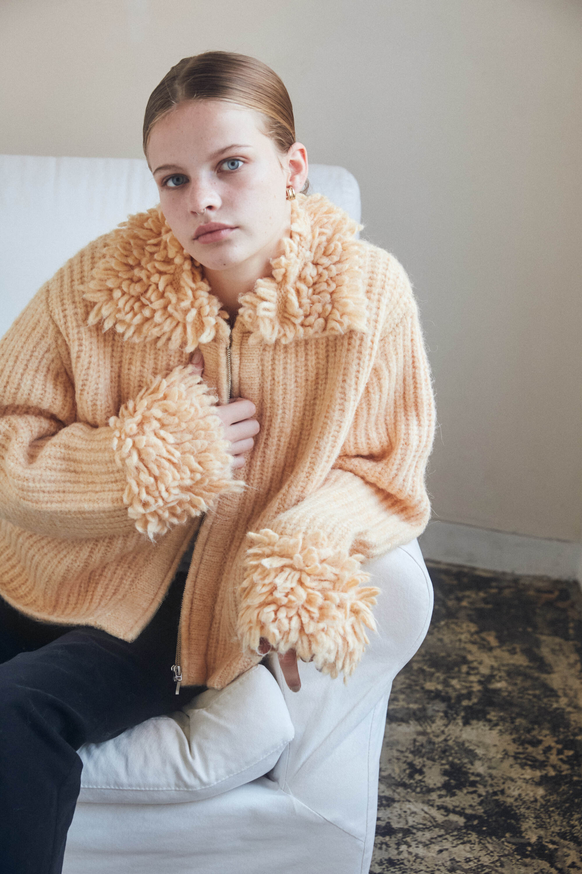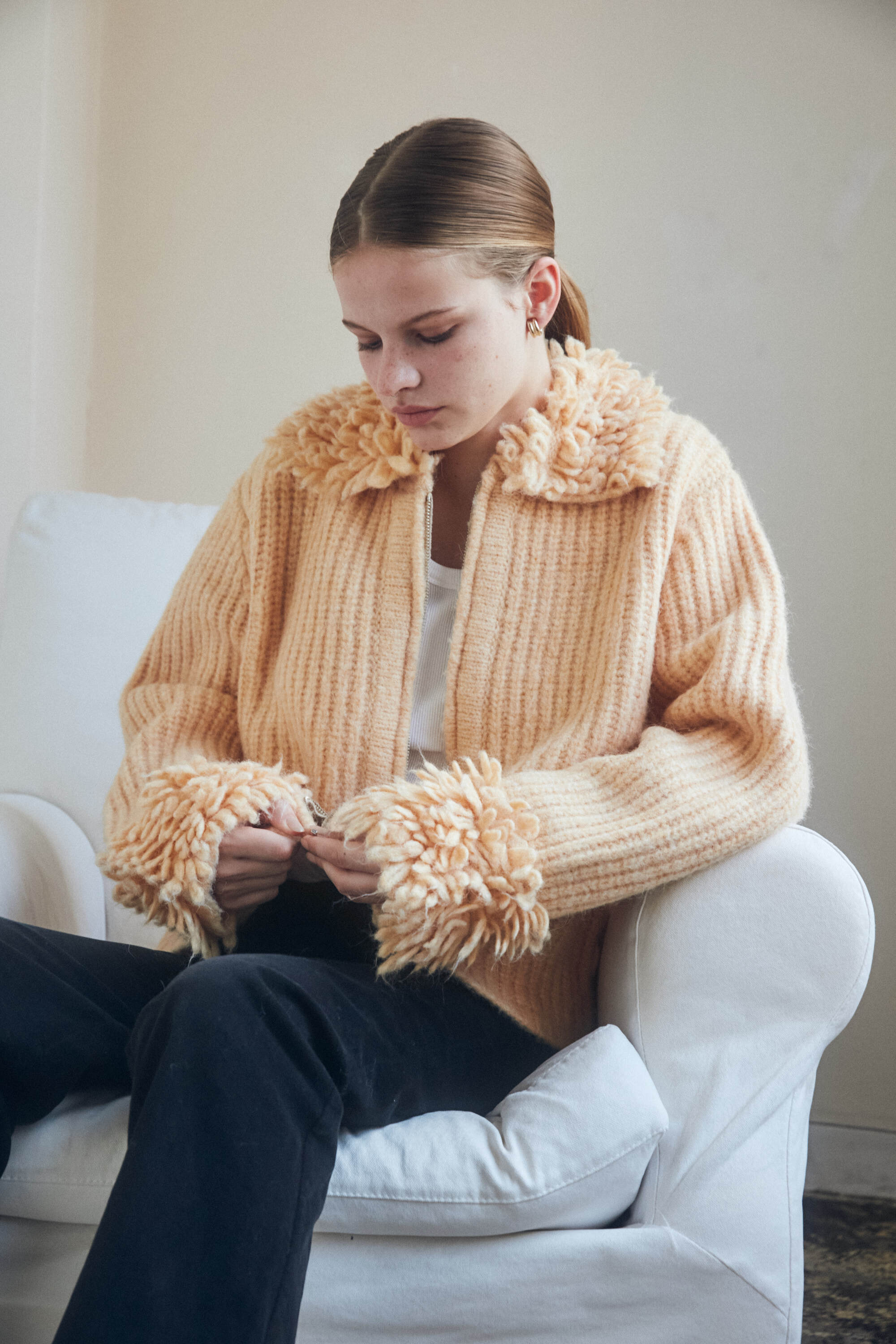襟と袖にループ編みを施し立体感を。